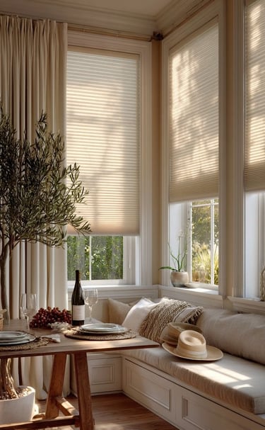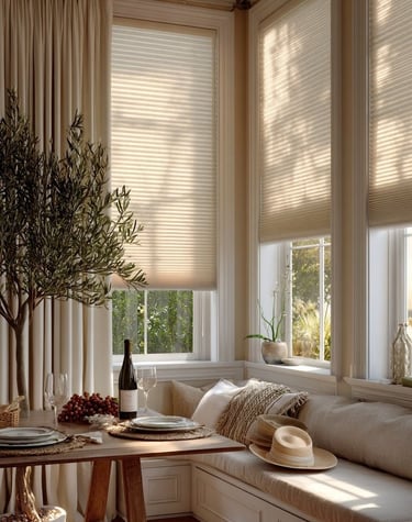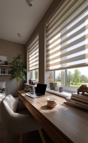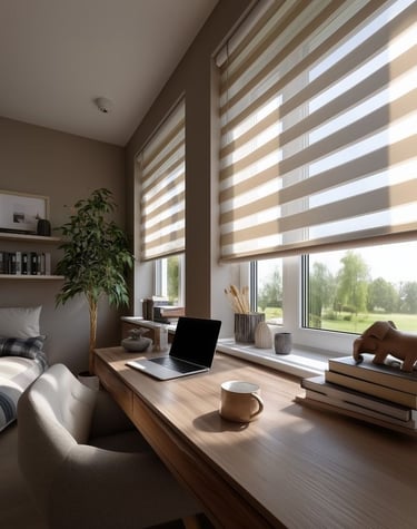 Custom zebra blinds adding texture and depth to a cozy reading nook, blending light and privacy effortlessly.